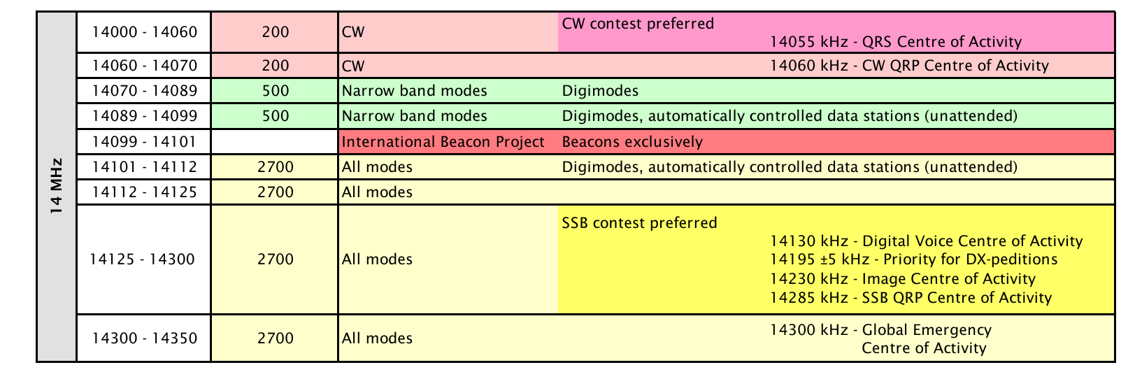 CW 14.000 bis 14.070 MHz QRP 14.060 MHz